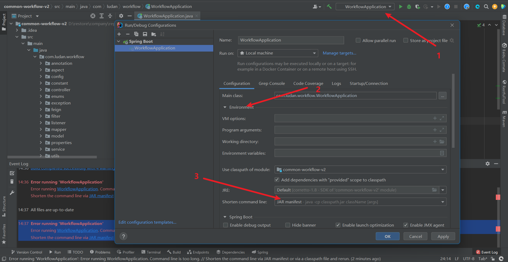 Error running 'WorkflowApplication' Error running WorkflowApplication. Command line is too long. Shorten the command line via JAR manifest or via a classpath file and rerun.